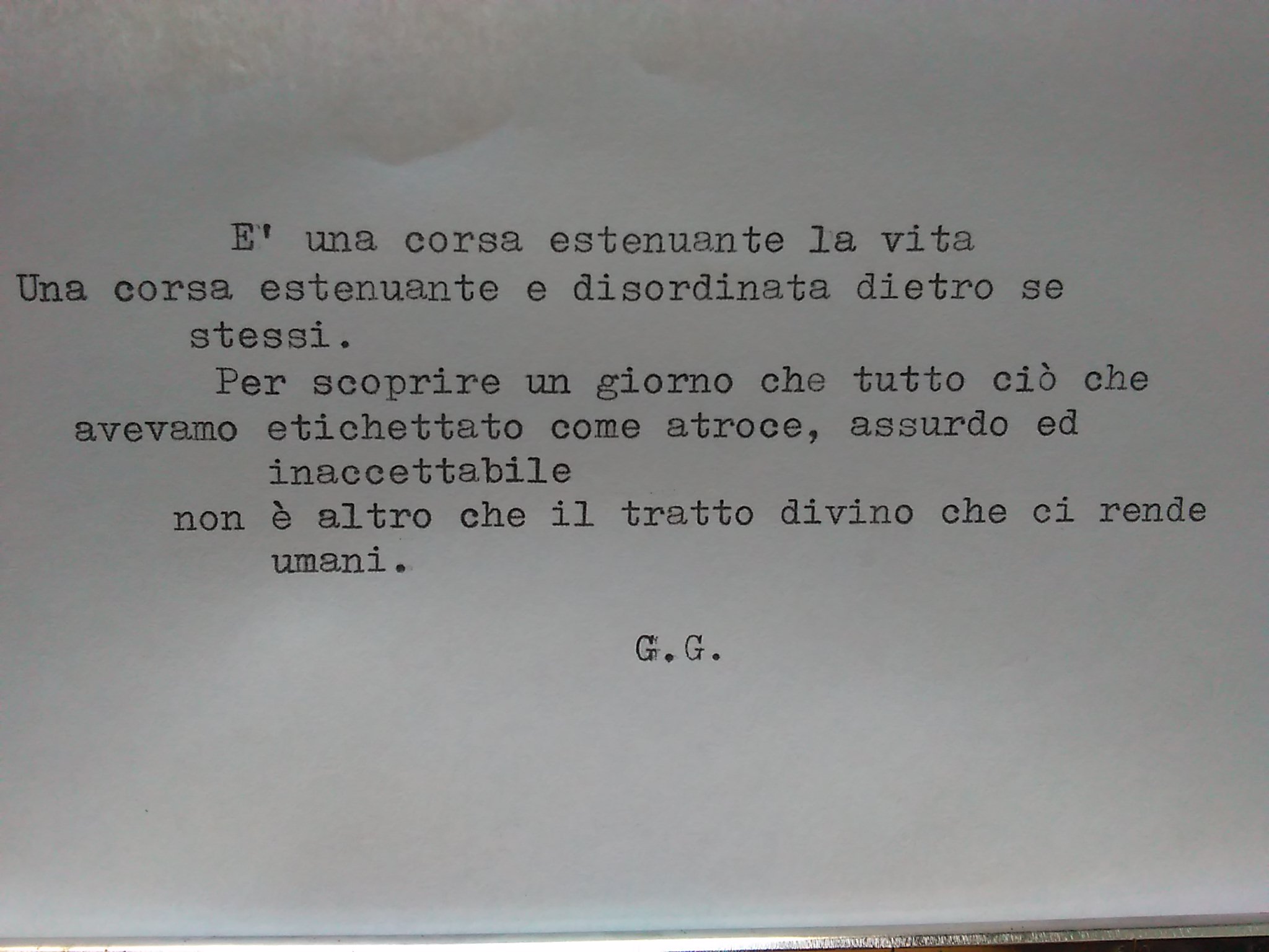Ma poi apro gli occhi, ed è solo un altro giorno. Roba che non so maneggiare come si deve, e allora lo maledico. Maledico la luce ed il respiro eppure il mio unico desiderio sarebbe quello di riuscire a bere almeno una volta quella luce sovrana dei mondi, di tutti i mondi in cui non sono questa sciocca accozzaglia di dubbi e paure.