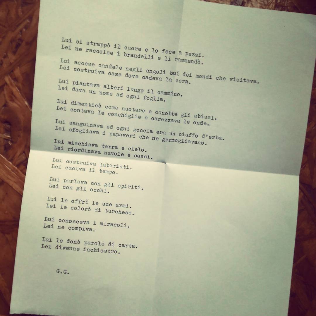 E quelle parole saranno ancora memoria dentro di te; perché è nella carne che i ricordi si infilano quando sei distratto. Si infilano nella carne come vermi, fino diventare carne stessa, fino a riempire ogni fibra del tuo corpo. Finirà che starai per scrivere una lettera, e ti fermerai chiedendoti perché lo stia facendo; finirà che ti mancherà tanto da odiarla perché non puoi farle altro che cercare di distruggerla, almeno quello. Almeno per trovare pace dentro alle macerie, sì, perché c’é sempre pace fra le rovine.